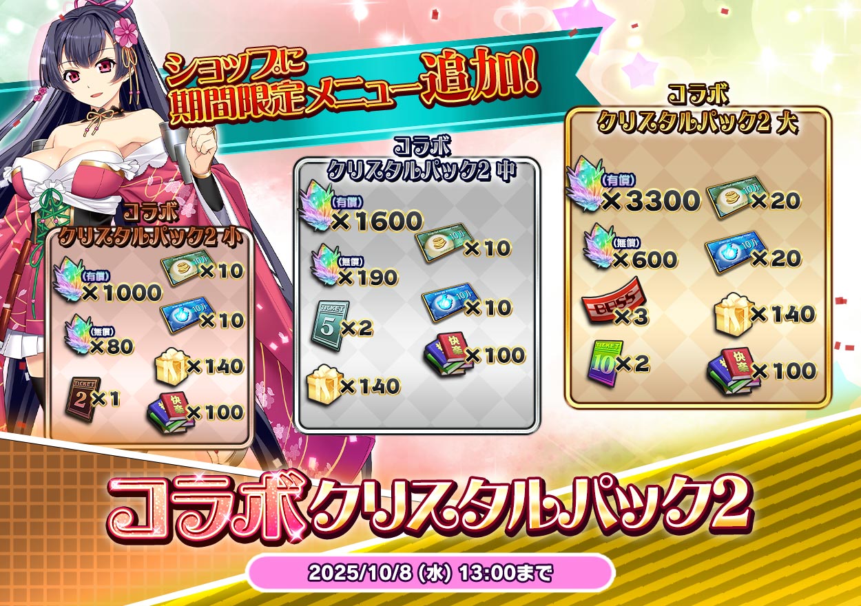 コラボクリスタルパック2 中 | 有償クリスタル×1,600 無償クリスタル×190 10万資金引き換え券×10 10万エナジー引き換え券×10 超高級プレゼントBOX×140 開発本6種×100 高速戦闘チケット5時間×2 |
