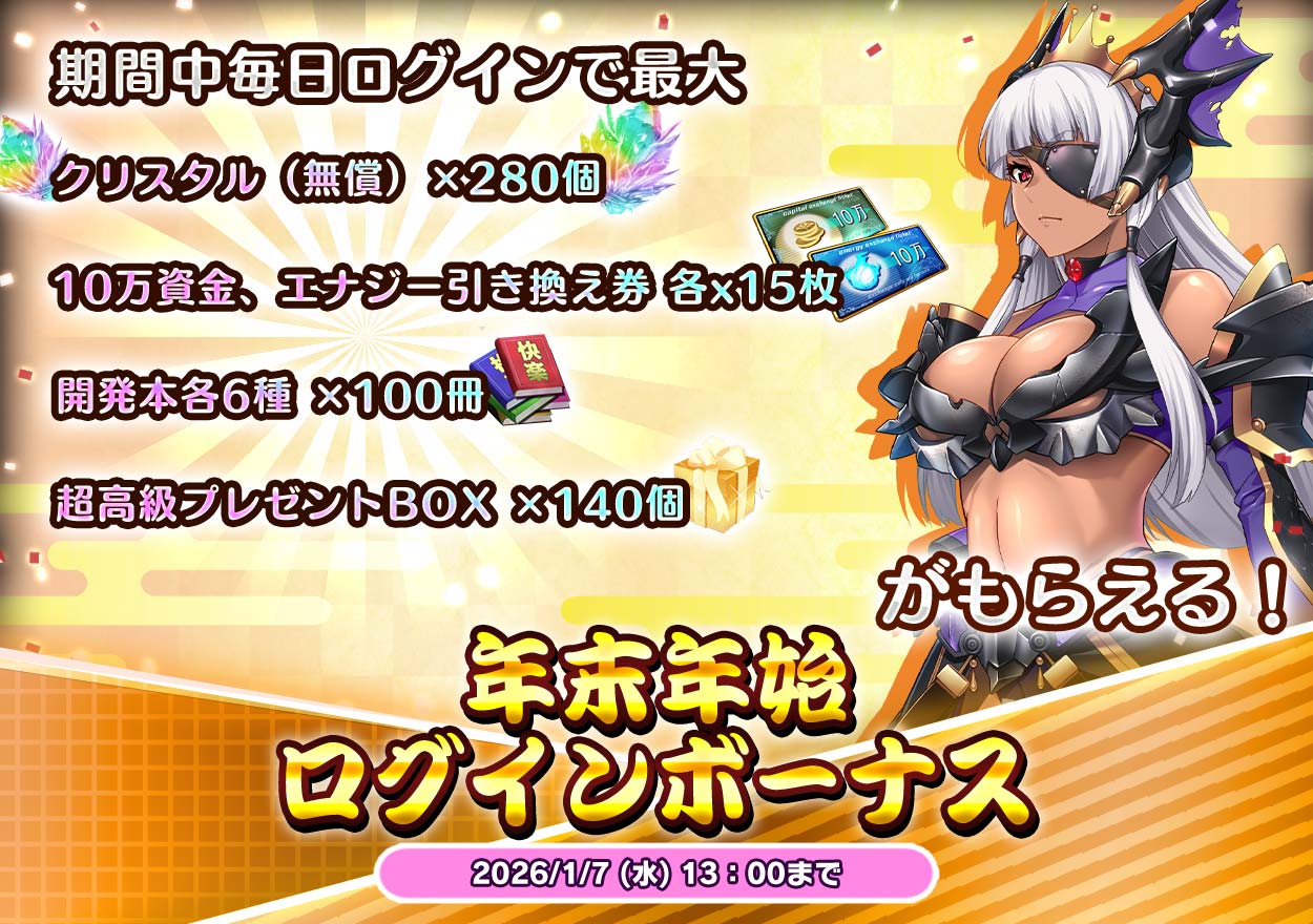 | 8日目 | クリスタル(無償) x20 快楽のススメ x50、10万エナジー引き換え券 x2 |